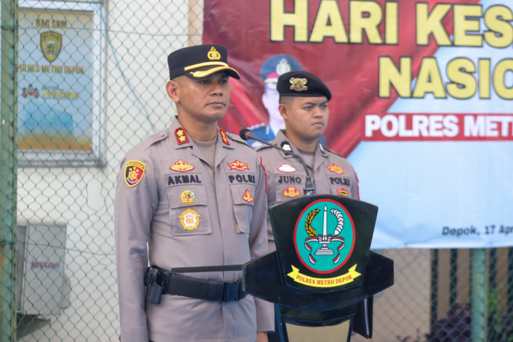 Polres Metro Depok menggelar Upacara Hari Kesadaran Nasional pada Jumat (17/4/2026) di halaman Mapolres Metro Depok. Kegiatan yang dilaksanakan secara rutin setiap tanggal 17 ini diikuti oleh seluruh jajaran personel, mulai dari pejabat utama, perwira, hingga bintara dan aparatur sipil negara (ASN) di lingkungan Polres.
