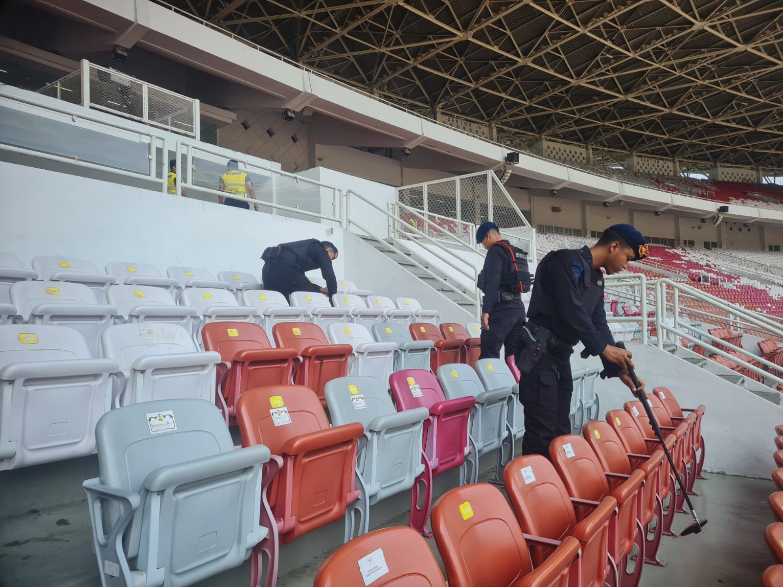 Sterilisasi dilakukan sebagai bagian dari prosedur pengamanan untuk memastikan seluruh area stadion dalam kondisi aman sebelum digunakan dalam pertandingan. Penyisiran dilakukan oleh Unit Jibom bersama K-9 di sejumlah titik, mulai dari ruang ganti pemain, ruang tunggu VVIP, ruang konferensi pers, tribun VVIP, bangku cadangan, hingga area lapangan dan fasilitas umum.