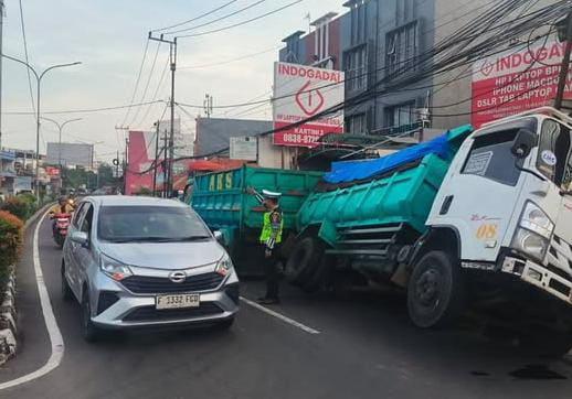 Depok — Satlantas Polres Metro Depok yang dipimpin Kanit Kamsel AKP Elly turun langsung ke lokasi untuk mengevakuasi truk yang terguling di Jalan Pemuda, Kartini, arah GDC, Rabu pagi.